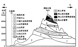 1、单选题 图示意博格达峰(天山)垂直自然带分布。完成下列各题。