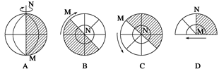 5、单选题 下面四幅图中所表示的自转方向正确,且NM为晨线的是(?)?