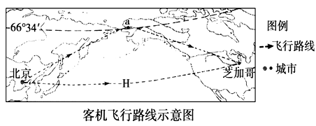 1、单选题 假设一架客机于北京时间6月22日12时从北京(116°E,40°N)起飞,7小时后途经a地(165°W,67°N)上空,14小时后抵达芝加哥(87.5°W,42°N)。据图,回答下列各题。