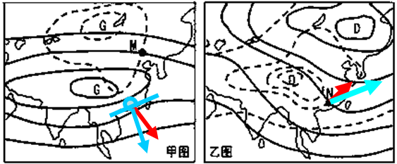 1.此时,图中甲地的风向和天气状况是2.影响图中乙城市形成的最主要自然区位因素