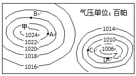 【小题1】就大气运动形式而言,图中甲是反气旋;就气压分布状况而言,乙是低压。