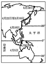 4、单选题 每年都有大量候鸟在澳大利亚和东亚之间来回迁徙,下图为科学家2010年用卫星追踪一只标号为“H3”的斑尾塍鹬迁徙路线,读图回答1—2题。