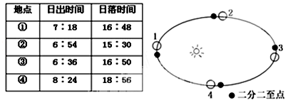 3、单选题 读2014年某日我国四地点日出日落时间表(北京时间)及下图,回答下列各题。
