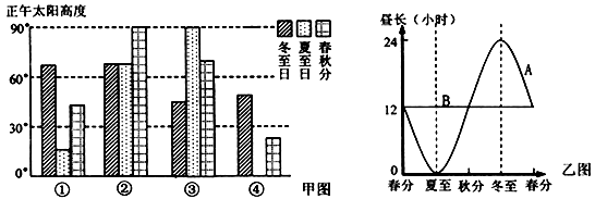 (2)从乙的昼夜长短变化图可以看出,B线是一年四季都是昼夜平分,所以这个地方一定是赤道;而A是在冬至时出现极昼,在夏至日时出现极夜,所以是南极圈,是对应的②.