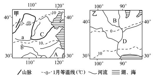 (4)甲图中 -10℃ 等温线在②处明显南凸,说明该处气温比同纬度附近地区要_____(高、低),其原因是?