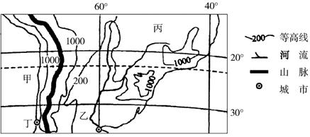 (4)根据所处的纬度位置及海陆位置判断气候类型。丁地位于30°S--40°S的大陆西岸,属于地中海气候,因冬季受西风带的影响,夏季受副热带高气压带的影响,所以其特点是夏季炎热干燥,冬季温和多雨。