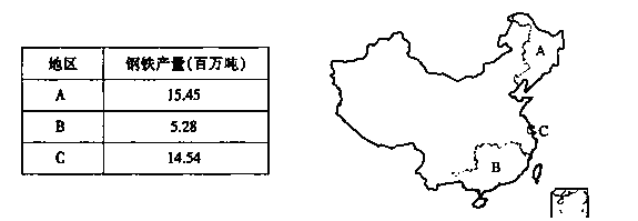 2、综合题 读下表和图,我国三个地区(A为东北,B为华南,C为长江三角洲)钢铁产量和区位分布示意图,完成下列问题(13分)