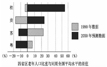 小题1:图中反映的老年人口比重变化趋势是广西、贵州两省区由低于同期全国平均水平的差值变为高于同期全国平均水平的差值,而江苏、广东则由高于同期全国平均水平的差值变为低于同期全国平均水平的差值,保持这种差异的最主要原因是广西、贵州经济较落后,大量青壮年劳动力外迁,导致青壮年人口比重减少,老年人口比重增加,而江苏、广东经济较发达,人口以迁入为主,迁入的主要是青壮年劳动力,使青壮年人口比重增加,老年人口比重相对降低,省际人口迁移差异不影响本身人口年龄结构,因此导致图中趋势不发生变化的最主要原因是省内人口迁移差异,选C。