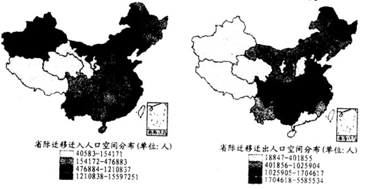 5、单选题 读我国2007年省际迁入人口、迁出人口空间分布图,回答下列各题。