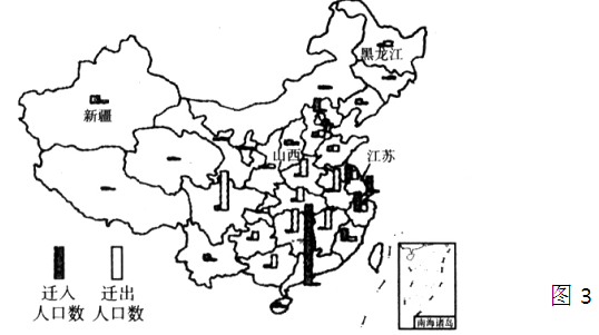 2、单选题 图3为“2000年我国部分省级行政区人口迁移示意图”。人口净迁入区是指迁入人口数大于迁出人口数的区域;反之,为人口净迁出区。读图完成8—9题。