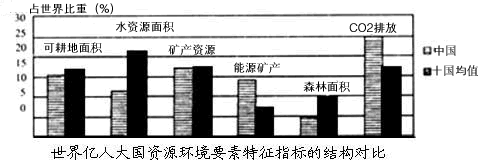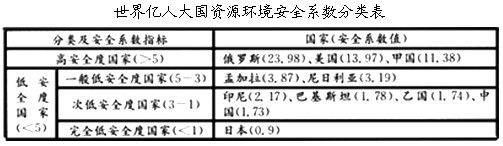 4、单选题 目前,资源环境安全越来越受到世界各国的关注,读“世界亿人大国资源环境要素特征指标的结构对比图”和“世界亿人大国资源环境安全系数分类表”,回答1~2题。