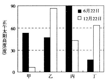 5、单选题 下图为6月22日与12月22日地球表面四地正午太阳高度。读图回答1~2题。
