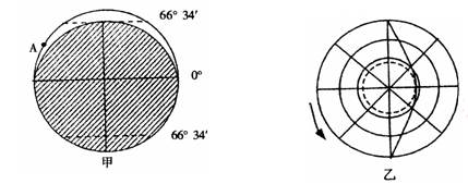 (5)乙图是甲图的极点俯视图,请在乙图上绘出甲图所示昼夜分布状况(用阴影部分表示夜).画出第四问中飞机飞行的路径(用箭头表示),并注明起飞处E和降落处F。