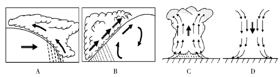 (5)在下列图中分别画出D天气系统气流的水平运动方向和垂直运动方向。(2分)
