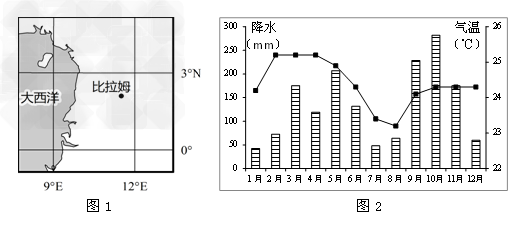 2、单选题 图2是图1中比拉姆的气温、降水量图。完成1-2题。?