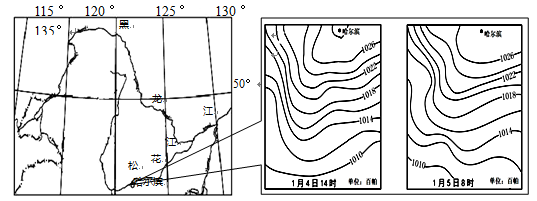 材料一:哈尔滨周边地区简图、哈尔滨两时刻海平面气压分布图。