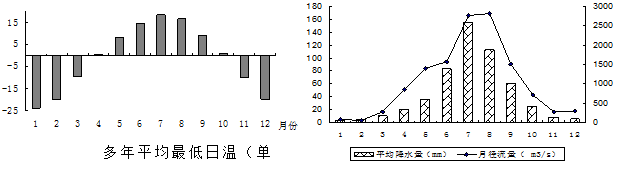 材料二:松花江(哈尔滨河段)多年平均最低日温、平均降水量、月径流量统计资料。
