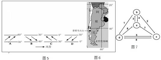 5、单选题 2011年6月4日,位于智利首都圣地亚哥以南的普耶韦火山群持续喷出高热烟灰及石块,大量火山灰及石块冲上云霄。结合材料及图5回答问题。