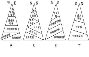 5、单选题 下图为“四地山地植被垂直分布示意图”,甲地位于南半球,其余均位于我国。读图回答题。