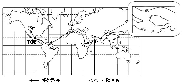 1、综合题 我国某校"环球探险社团"在暑期进行了网上模拟探险活动,下图表示探险区域和探险路线,读图回答下列各题。