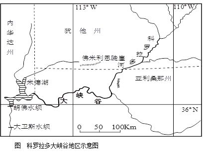 3、单选题 北美大河科罗拉多河,发源于落基山脉西部,汇入加利福尼亚湾。流域干支流多峡谷,河床比降大,其大峡谷段是世界上最壮观的河谷景观之一。读图,回答下题。