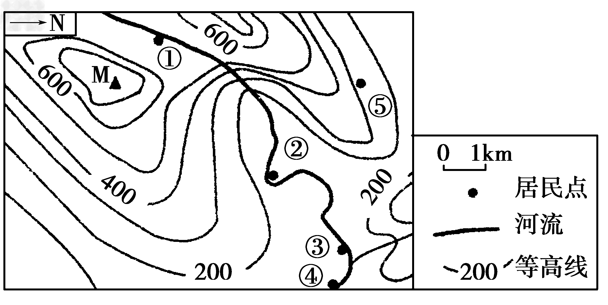 D.由⑤居民点取近道攀登M山忽上忽下较耗体力