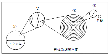 1、综合题 人类目前观测到的宇宙半径约为140亿光年,这被称为“可见宇宙”或“已知宇宙”;从某种意义上讲,总星系就是可见宇宙。读宇宙中天体系统层次关系图(下图),回答下列问题。