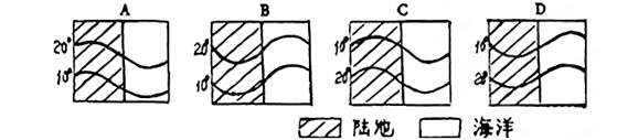 本题解析:北半球越向北温度越低,因此图中A、B可排除;受洋流影响,等温线弯曲方向和洋流流向一致,据此可判定C图中洋流自北向南流,根据等温线数值变化可知,该洋流为寒流,错误;D位于北半球,为暖流,正确。