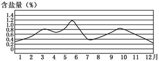 小题1:结合曲线图,3~6月和9—11月两个时间段内土壤含盐量较高,而在7~8月份的夏季和1月、12月的冬季含盐量最低。大致是春秋返盐、夏季淋盐。