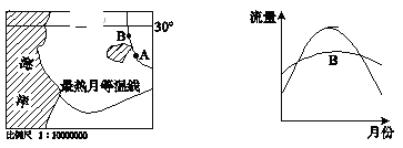 3、单选题 图中陆地地势较为平坦,右图中年径流量曲线是从左图中A、B两处测得的。读图,回答下列各题。