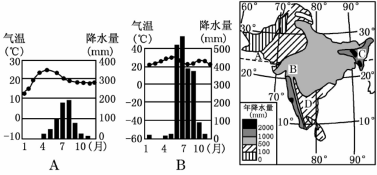 (1)A、B两地最高气温出现在5月前后,其主要原因是____________________________。(2分)
