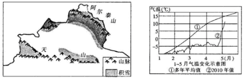 材料二?下图为2009~2010年冬季北疆地区积雪分布及阿勒泰地区800米某地1~5月