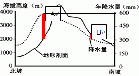 小题1:考查学生的读图能力,随意找出一个高度,如下图所示比如2000米处,北坡和南坡的降水量度在降水量曲线上读数分别为A(600毫米)、B(不到300毫米),即同一海拔高度,北坡降水量较多。