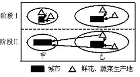1.阶段Ⅰ鲜花和蔬菜产区形成的主要区位因素是2.阶段Ⅱ甲城市鲜花和蔬菜全部从乙输入,其主要原因是: