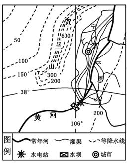 2、综合题  (10分)年降水量仅200mm左右但蒸发量达1600mm的宁夏平原,因黄河贯穿,湖泊众多,加之贺兰山的“守护”,盛产稻米、枸杞等名特优产品,有着“塞上江南”的美誉。右图为宁夏平原及周边区域图,