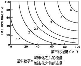 小题2:依据该模式推论,某市1970年都市化程度20%,下水道普及率40%;2000年都市化程度90%,下水道普及率80%;则2000年的径流量约为1970年的多少倍(?)