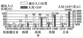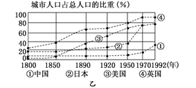 材料2:部分国家城市化及其经济发展情况统计图(图甲)和部分国家城镇人口在总人口中所占百分比统计图(图乙)。