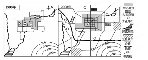 3、单选题 如图是“我国某城市发展过程中1990年和2008年比较图”,读图回答问题。