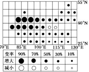 小题1:理解题干含义,抓住图示的基本信息,并能利用经纬度进行区域定位是解题的关键。注意结合我国东部地区的气候特征进行分析降水量的变化。根据经纬网定位,注意图例——实心圆圈大小代表的是变率大小,西北地区实心圆圈最大,所以该地区降水变率最大,故选项C正确。