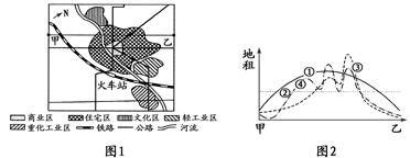 小题2:甲乙一线,首先经过铁路,由于铁路沿线会产生噪声污染,故地租较低;由郊区向市中心地租增加,又由于甲乙一线经过公路,交通通达度较高,故出现地租高峰,由市中心向郊区地租又下降,故④线正确。