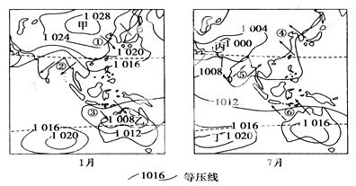 2、单选题 读世界某区域1月和7月海平面气压(单位:hPa)和风向图,①~⑥处的箭头表示风向,据此回答下列问题。