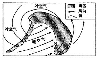 【小题1】若M点吹东南风,则该天气系统所处的位置和性质分别为