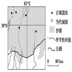 小题2:从图中的古城遗址与当代城镇相比,出现了现代城镇明显向河流的上游迁移的特点。原因可能与人口数量的增多,工农业、生活用水量的增大,上游过度用水,下游因断流而无水可用,人们不得不向河流上游迁移。故选B。