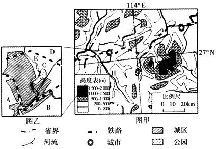 (1)读甲图判断所示区域主要地形类型及图中H河的大致流向。