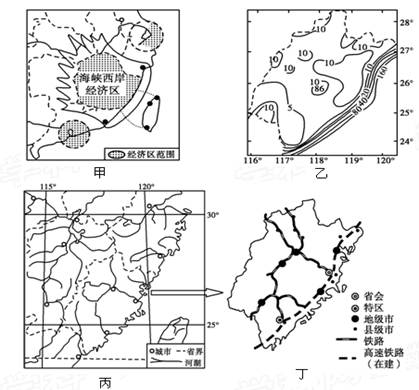 材料二?下面图8四图分别为海峡西岸经济区示意图(甲),福建省全年大风天数分布示意图(乙),某区域图(丙),福建省城市、交通线的分布图(丁)。