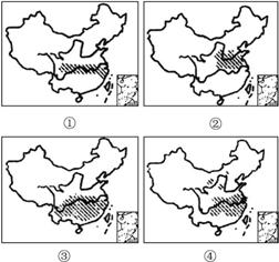 3、单选题 读下面油菜、冬小麦、茶叶和水稻四种农作物集中产区分布图,完成(1)--(2)题。