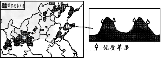2、综合题 充分认识区域地理特征,因地制宜开发区域优势资源,发展经济,保护生态,有利于促进区域可持续发展。下面左图是我国北方苹果优势产区分布图;右图是A地某村优质苹果分布示意图。
