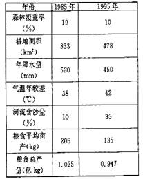 小题1:根据图表信息可知,植被覆盖率减小,耕地面积增加,河流含沙量增加等信息分析可知是由于破坏植被,毁林开荒。选择B项。
