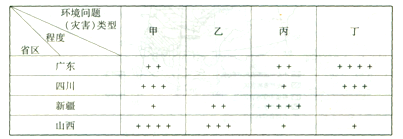 小题1:甲问题在山西最为严重,可能是水土流失;乙问题在广东、四川基本没有,代表的是寒潮;丙问题在新疆最为严重,代表的是土地荒漠化;丁问题主要在南方地区,可能是酸雨。符合的是D。