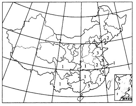 2、多选题 《中国城市竞争力报告》依据居住环境、生态环境等14项指标,对我国200个城市2006年度宜居状况做了评估。下图是对2006年度宜居状况做了评估。图中数字是前30名的城市在各省级行政区的分布个数。读图回答1~2题。